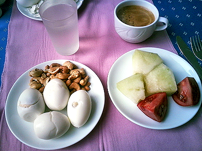 To the hotel I had a jar of peanut butter with me. This would be my main fat source. The jar was emptied 2 days before heading home, at which point I bought myself a bag of cashew nuts. 50 grams of peanut butter or 50 grams of cashew nuts were added with each breakfast. Sometimes I added a little during lunch and dinner as well.